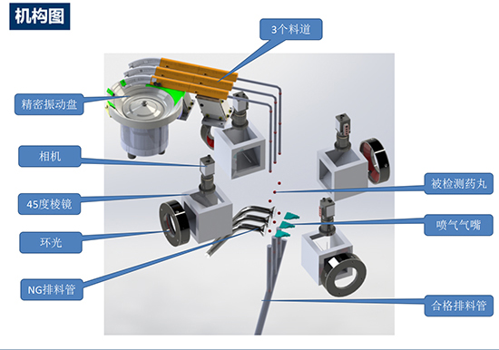 在藥粒檢測過程中,需進行藥粒上白點、藥粒圓不圓、藥粒的粘連、藥粒的色澤正確等功能,檢測完成后輸出OK、NG信號,在排廢位進行剔除動作。系統采用進口工業相機快速獲取產品圖像,通過圖像識別、分析和計算,輸出檢測信號。 二、【藥粒檢測系統結構圖】